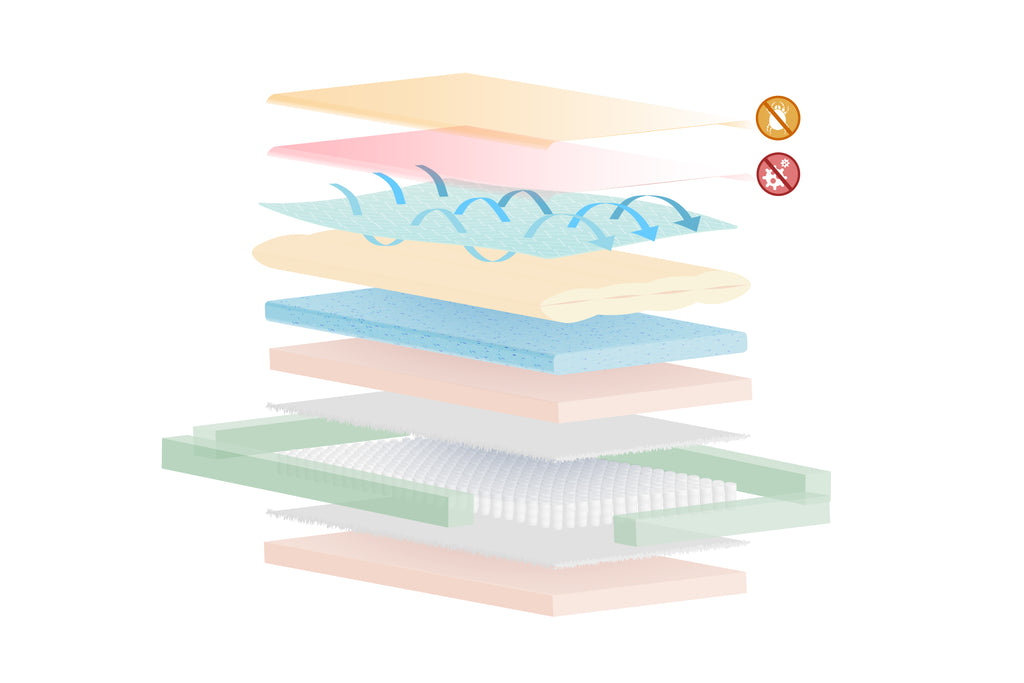 Covered with Ice Cool knitted fabric, the advanced CoolTech technology regulates your body temperature for a comfortable and undisturbed sleep.